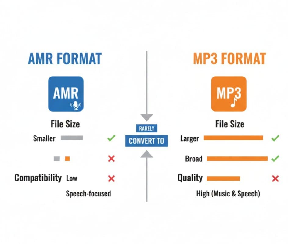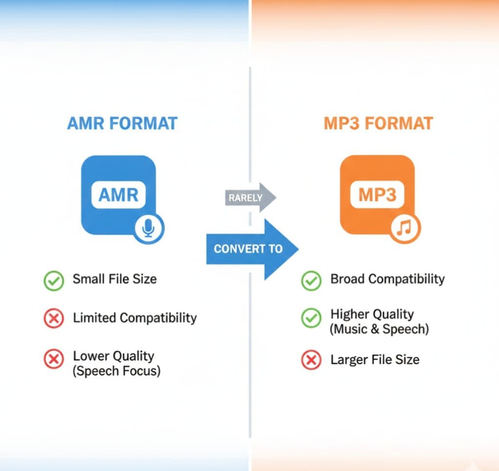 AMR (Adaptive Multi-Rate) is optimized for voice recordings but has limited compatibility. Converting to MP3 ensures playback on any device or media player.