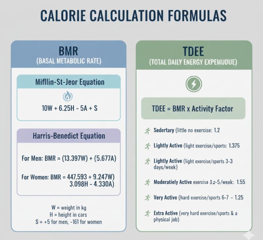 A calorie calculator uses scientifically validated formulas to estimate your daily energy needs. The most common formulas include: