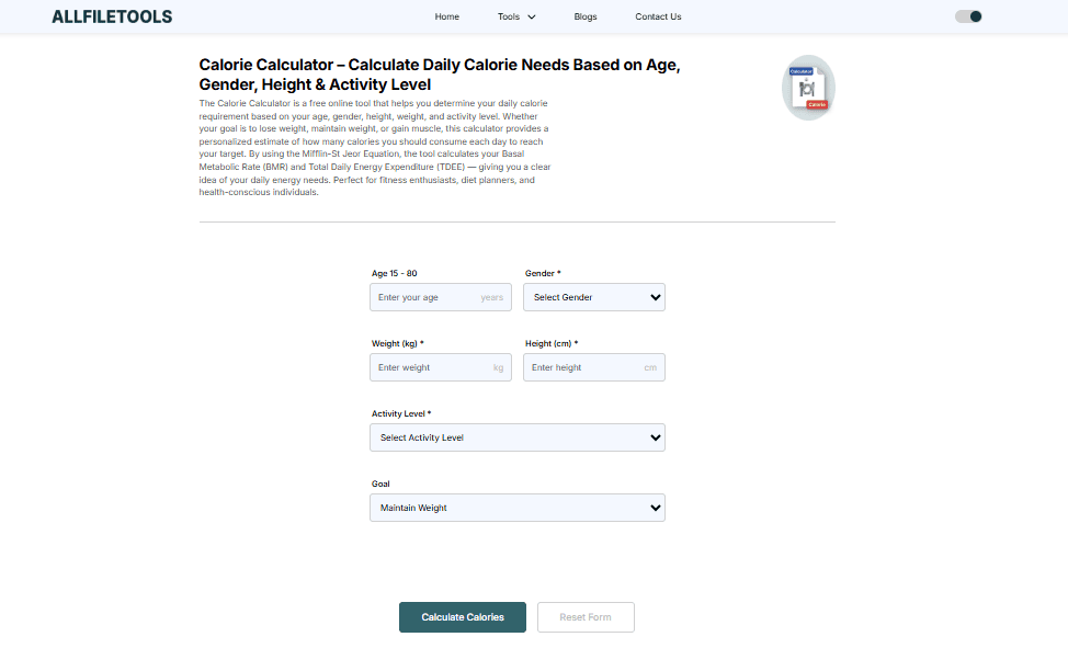 Using the AllFileTools Calorie Calculator is straightforward and beginner-friendly. Follow these steps: