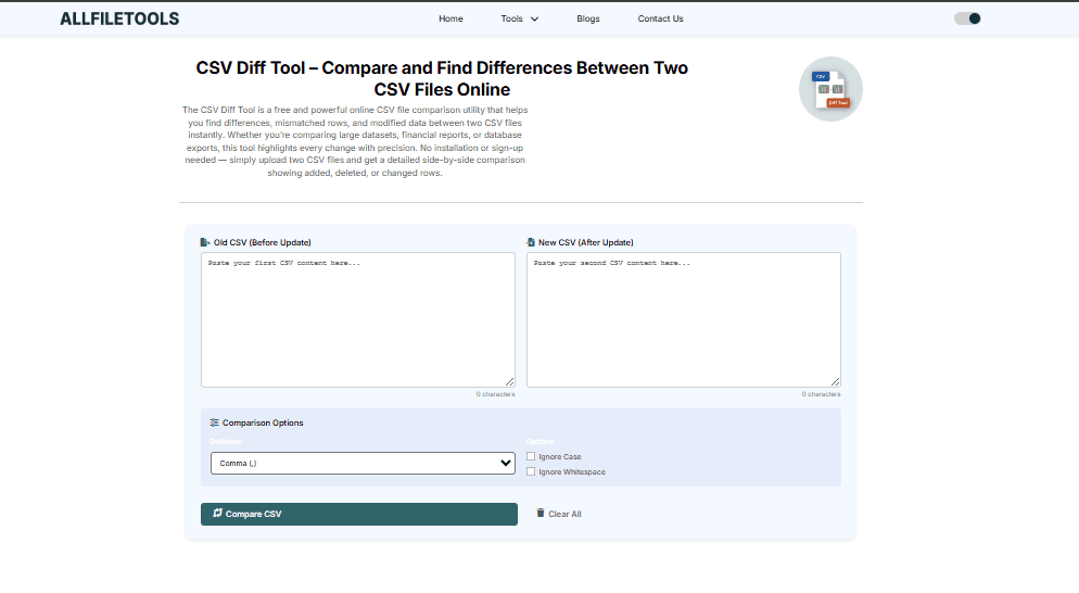 In today’s data-driven world, handling large datasets efficiently is no longer optional — it’s essential. Whether you’re a developer managing server logs, a data analyst working with sales data, a student comparing research outputs, or a marketer verifying campaign results, CSV files are everywhere. But what happens when you need to compare two CSV files and find the differences quickly and accurately? That’s where a CSV Diff Tool comes into play. In this blog, we’ll explore the ins and outs of CSV comparison, introduce the best practices, highlight common challenges, and show you how AllFileTools CSV Diff Tool can simplify your workflow.
