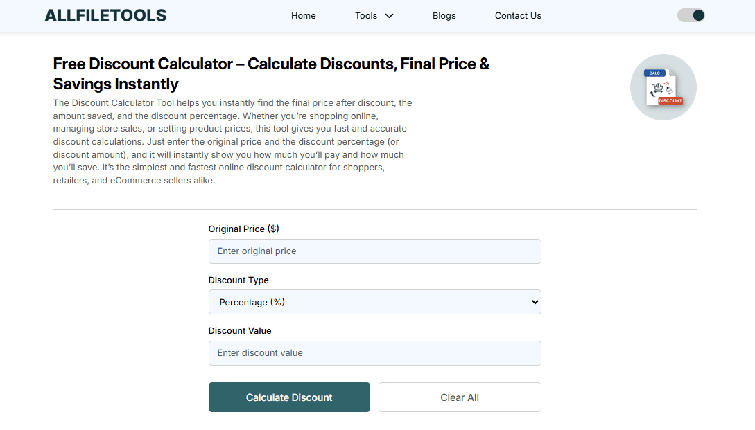 A tool like AllFileTools Free Discount Calculator provides all these features in one place.