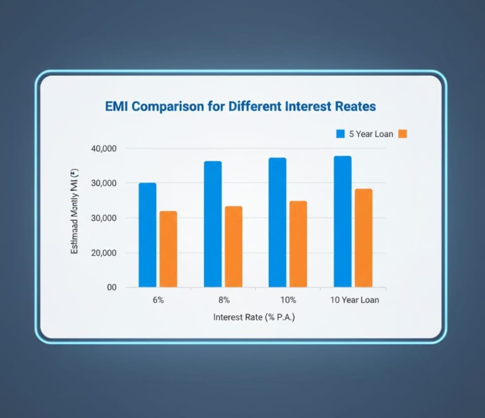 Interest rates are the cost of borrowing. A higher interest rate increases your EMI, while a lower rate reduces it. Using the calculator, you can test scenarios: