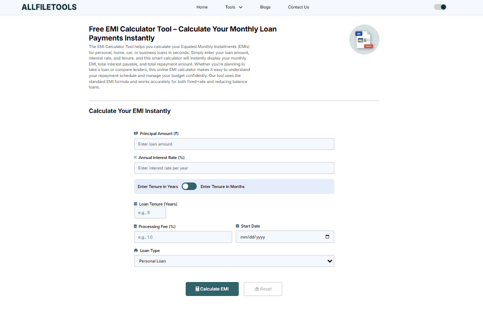 Calculating your monthly loan payments doesn’t have to be complicated. Whether you’re planning to buy a home, purchase a car, or take a personal loan, understanding your EMI (Equated Monthly Installment) is crucial for effective financial planning. Fortunately, with our Free EMI Calculator Tool, you can calculate your monthly loan payments instantly with complete accuracy. This guide will not only help you understand how EMI works but also walk you through using the calculator and the benefits of using such a tool in your financial planning.