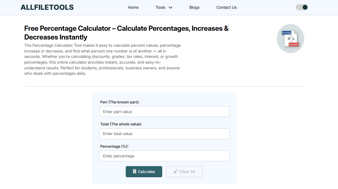 The Free Percentage Calculator is a versatile, user-friendly, and efficient tool for anyone who needs accurate percentage calculations quickly. Whether you are a student solving homework, a business owner calculating profit margins, a shopper checking discounts, or a professional handling finances, this tool simplifies the process and ensures accuracy.