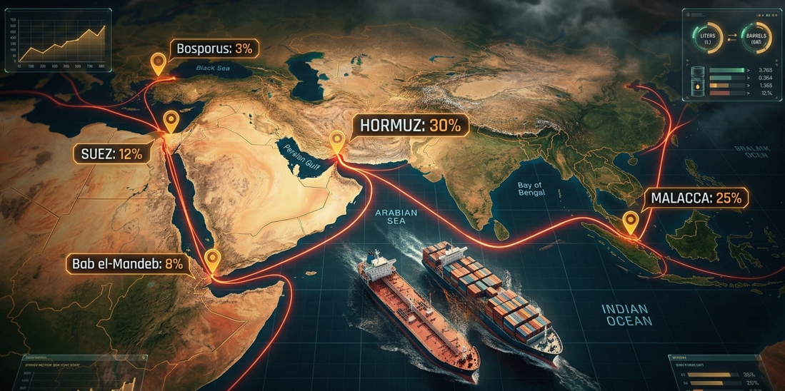 The world’s oil supply relies on a few remarkably narrow choke points. When war or tension hits these specific strips of water, the percentage of global trade at risk is staggering. Here is the detail table of explaining these choke points percentages: