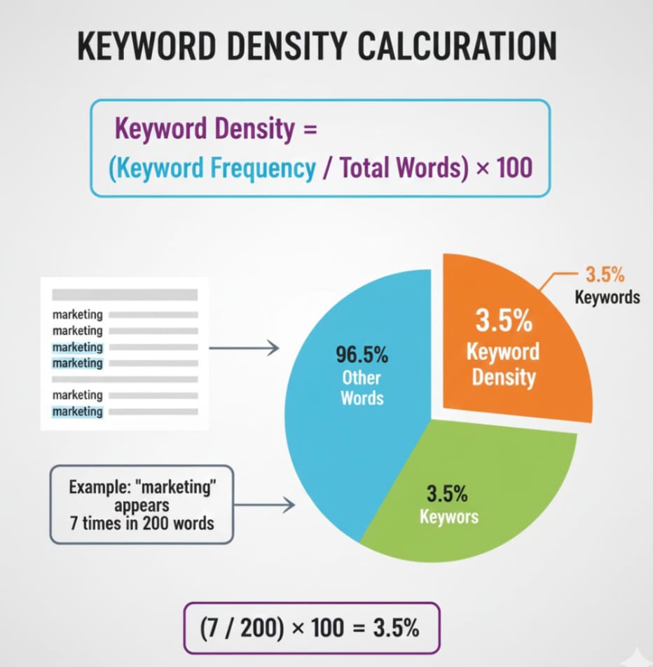 Keyword Density (%)=(Number of times keyword appearsTotal word count)×100\text{Keyword Density (\%)} = \left( \frac{\text{Number of times keyword appears}}{\text{Total word count}} \right) \times 100Keyword Density (%)=(Total word countNumber of times keyword appears)×100