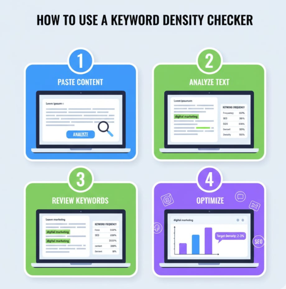 A keyword density checker is a tool that calculates how often a specific keyword appears in your content relative to the total word count, helping you optimize content for SEO.