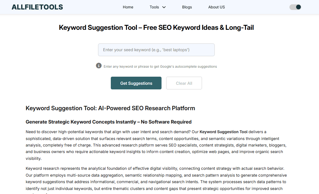 Enter the Keyword Suggestion Tool — a powerful, free online SEO tool that helps you generate keyword ideas in seconds. Whether you are a beginner trying to understand SEO or a seasoned professional looking to expand your content strategy, this tool provides accurate, high-volume, and long-tail keywords to boost your search rankings.