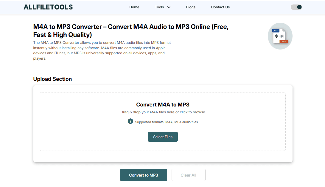 Our recommended tool for converting M4A to MP3 is the AllFileTools M4A to MP3 Converter. It’s designed for users who want fast, secure, and high-quality conversion without any technical hassle.