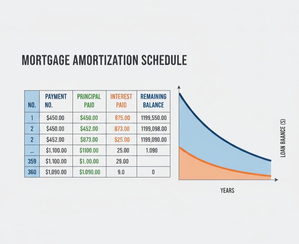 An amortization schedule shows how your mortgage is repaid over time. Each payment reduces the loan balance (principal) and pays interest. Early payments are mostly interest, while later payments contribute more to principal.