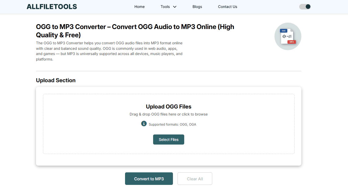 Here’s how you can convert OGG files to MP3 using AllFileTools OGG to MP3 Converter: