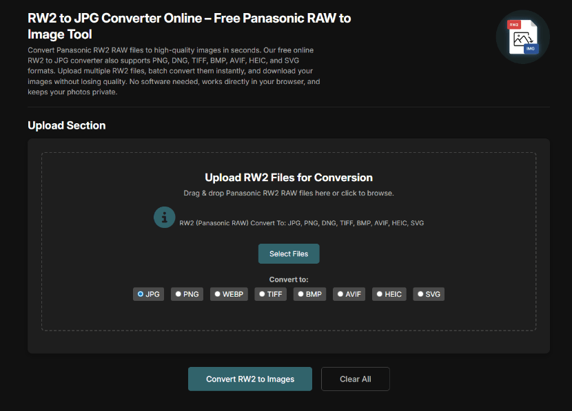 - Multiple formats supported: Convert RW2 to JPG, PNG, DNG, TIFF, HEIC, or AVIF