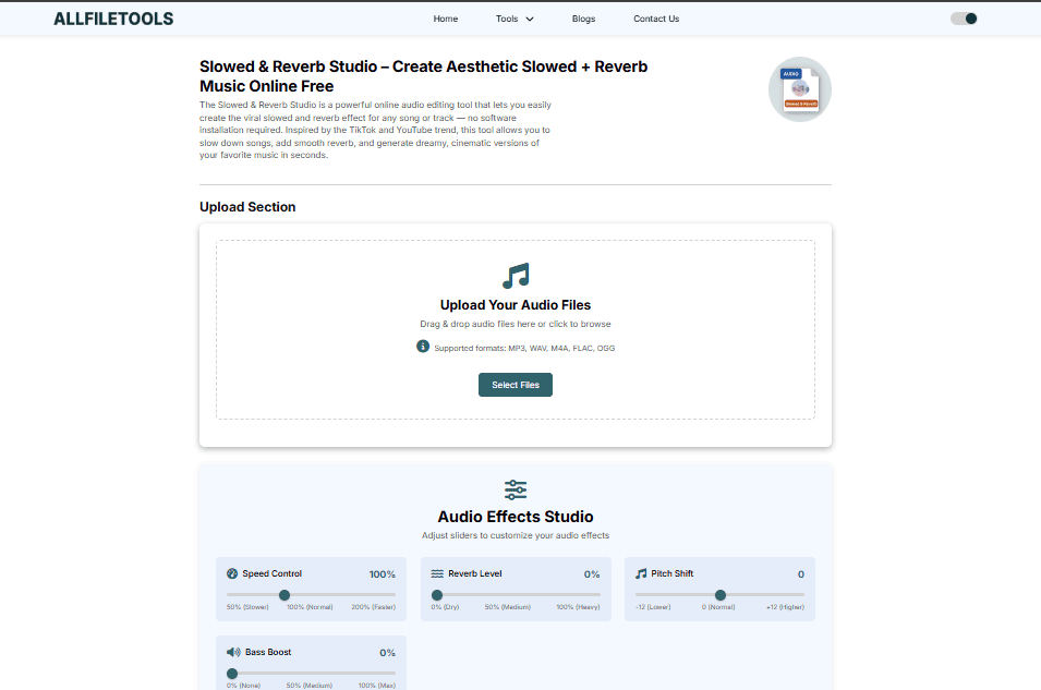 Whether you’re a content creator, student, DJ, or simply an aesthetic music lover, this tool empowers you to experiment, create, and share your own slowed + reverb music effortlessly. Dive in, try it out, and let your creativity flow!