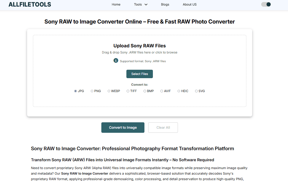 Feature Keyword Notes: These features are commonly searched by photographers and designers, making the tool highly discoverable via keywords like “Sony RAW converter online,” “convert ARW to JPG,” or “fast RAW photo converter.”