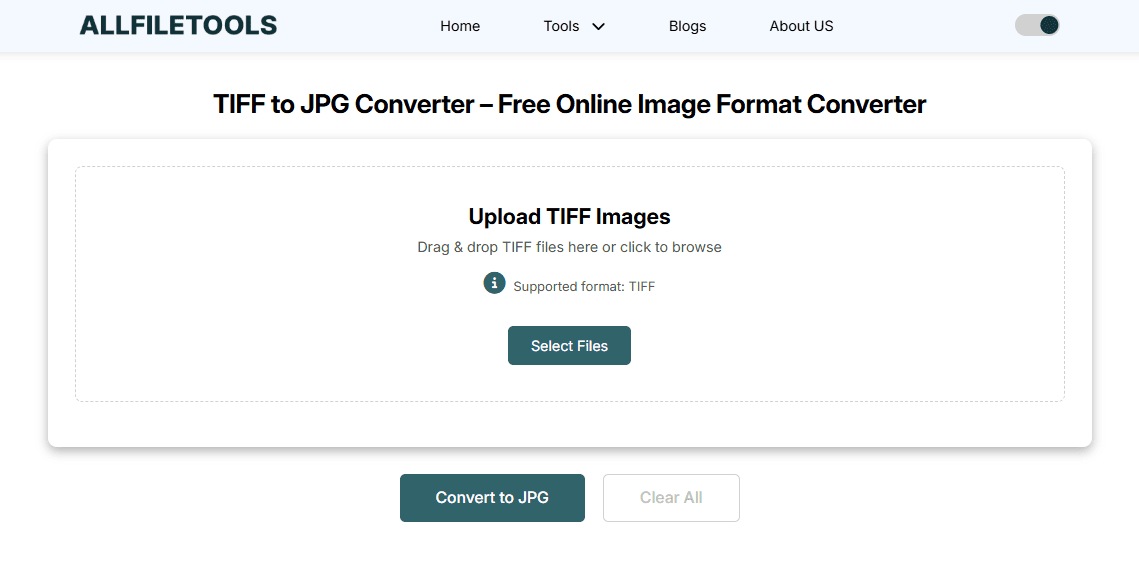 Open the online tool: https://www.allfiletools.com/tiff-to-jpg/ -